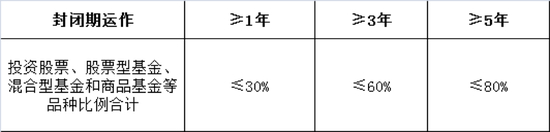 五是根据《养老目标基金指引(试行)》规定,对应养老目标基金封闭运作期不同,其投资比例上限也不同: