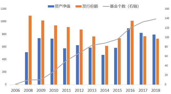 投资者起初的认购热情和后来基金惨烈的业绩,使得QDII在此后很长一段时间都不被投资者待见,产品规模持续下滑。虽然之后QDII基金每年都有新产品发售,但规模都偏小。作为QDII基金元年的2007年成了QDII历史上基金规模(份额数)的顶峰,虽然当时只有5只产品而现在有接近140只基金。