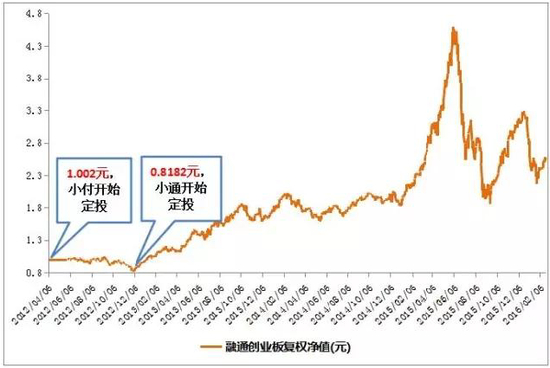2012年5月,融通创业板基金成立后不久。她就去做了一份融通创业板基金定投。她说,创业板就是今天你看不起,明天就高攀不上,定投要趁早!