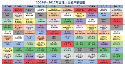 在近10年大类资产表现前三名的排行中(见2008年~2017年全球大类资产表现图),私募股权(5次)出现次数最多,其次是中国A股、黄金、全球地产投资信托(4次),然后是美元指数、新兴市场和发达国家股市(3次)。