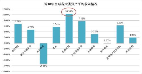 不难看出,私募股权在近十年的表现中,一半的时间表现都稳居前三,并且只有2008年受全球系统性金融危机影响收益为负之外,其他年份收益均为正,近十年平均收益领跑其他资产达到10.38%,远高于位列第二、三位的发达国家股市(7.82%)和中国A股(6.78%)。