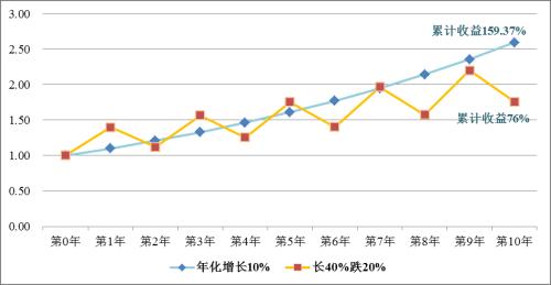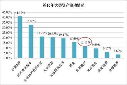 二是因为长期来看稳定增长的收益会大于波动增长。比如每年以10%增速成长的资产在10年后累计收益会达到将近160%,而先增长40%再下跌20%的资产(同等平均收益)在10年后累计收益仅为76%,稳定增长收益约为波动增长的1.5倍。而近10年,私募股权的波动性仅为12.11%,比国际公认的避险资金黄金(15.69%)还稳定。