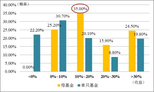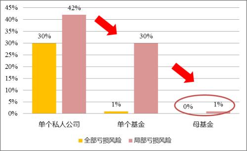 母基金之所以成为社保基金的配置首选,是遵循“鸡蛋不能放在同一个篮子里”的理念,将资产配置在相关性较低的医疗、金融、消费、科技等领域,有效分散非系统性风险。单个项目局部亏损的概率高达42%,单个基金局部亏损概率下降到30%,而母基金局部亏损概率仅为1%。同时,母基金可以较好的获取到新经济成长领域朝阳行业的成长红利,母基金投资的负收益几乎为0,收益大概率(35%)会集中在10%~20%的区间。