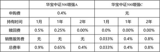 C类——不收申购费,一般持有一段时间后就不收赎回费,但是要比A类份额多收0.4%的销售服务费(年费率),按日计提。如华宝中证500增强C(005608)。(数据来自于华宝基金官网)