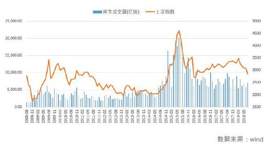第一张图,是沪深两市成交量和上证指数的走势对比。