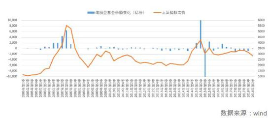 第二张图,是全市场偏股型基金份额变化和上证指数的走势对比。
