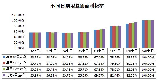 最大的差异出现在10年期(120个月)的定投上,每月30日扣款的定投盈利概率也仅比每月7号扣款的少4个百分点,差距并不大。