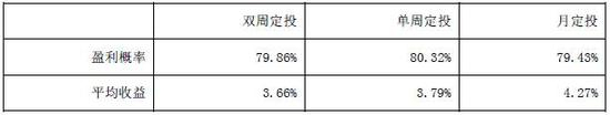 定投频率对盈利概率、平均收益的影响微乎其微,不同频率的定投盈利概率在80%左右,平均收益在4%左右。