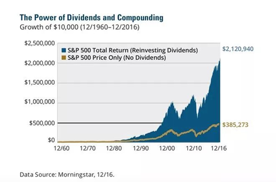 但如果你将股票分红再投资于标普指数中,这笔钱在2016年底将高达212万美元(212倍)。