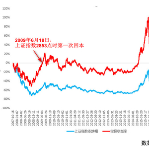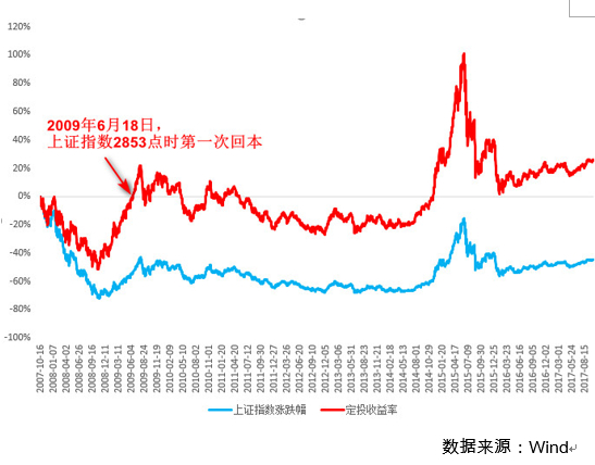 这笔定投在2009年6月18日2853点第一次回本。期间上证指数下跌53%。