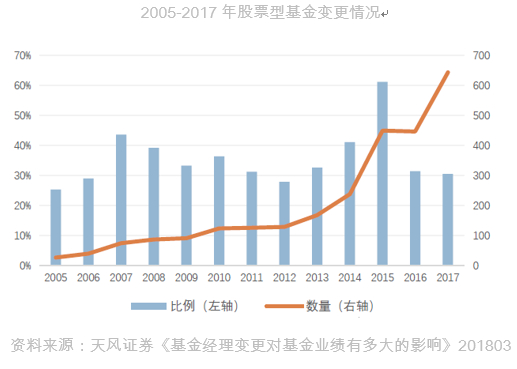 天风证券今年3月发布的研报显示,2005年以来,股票型基金经理变更的比例平均在30%左右;2015年甚至达到了60%。