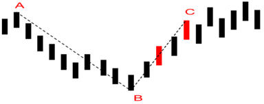 1. 如图4所示,B和C之间满足顶分型的条件,且顶分型之间至少1根K线相隔,其二是从B开始行情上涨至最高点,则B的拐点确认。