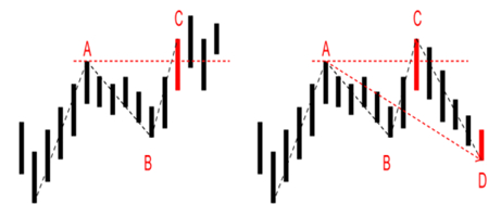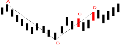 3. 如图6所示,C点如果满足符合B点上涨以来的最高点,且高于A点,则不需考虑顶分型的情况,B的拐点确认,否则如右图所示,价格跌至D点,若BC没有形成上涨笔,则下跌AD最高点将位于C,而不是波段价格的起始点,B的拐点同样确认。