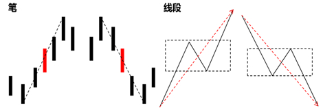 确定分型后,两个相邻顶分型和底分型的顶底之间连线叫做笔,但需要注意是顶分型和底分型之间至少要有一根独立K线,即需要满足缠论中所说的结合律。线段至少要由三笔组成,且前三笔必须有重叠的部分,也称为中枢,如图2所示。
