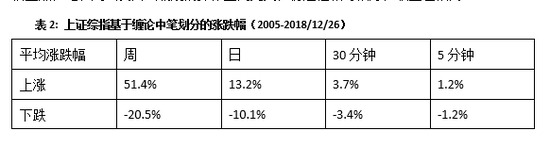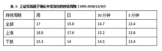 以下表格是从持续周期的长度和涨跌幅度两个维度对不同级别的波段进行统计的。周线级别(包含上涨和下跌)平均持续时间17个交易周,日线级别15.8个交易日,30分钟级别约为0.98个交易日,5分钟级别0.4个交易日,缠论的笔划分在分钟级别的持续周期从K线周期的角度来说也更短。