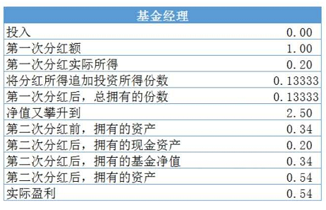 基金经理呢?他和你一样,第一次分红后,他将分红的0.20,也追加投资了基金。得到0.1333份。第二次分红后,他的资产是:0.53333333,如下表所示: