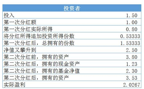 考虑到第二次分红,分红后,你有1.53333份净值为1.50元的基金,还有分红所得现金。现金是1.53333×1.00×(1-20%)=1.2267。分红后,您的资产是:1.533333×1.50+1.2267=3.5267元。实际盈利是:3.5267-1.50=2.0267