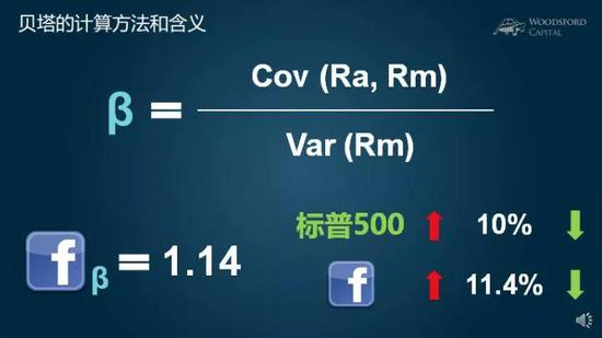根据这个公式,我们可以计算得出,Facebook在过去三年,相对于标普500指数的贝塔值为1.14左右。这是什么意思呢?就是说,如果标普500指数上涨10%,那么facebook股票的价格大约会平均上涨11.4%左右。而如果标普500指数下跌10%,那么facebook股票的价格则会下跌11.4%左右。