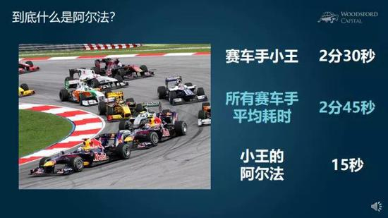 要回答这个问题,关键是看他的成绩和谁来比。假设我们获知,所有赛车手跑完一圈的平均耗时为2分45秒。那么我们就可以计算得出,小王比平均的赛车手水平快了15秒。这,就是小王的阿尔法。