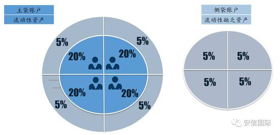 假设一个开曼基金有4个投资者,基金中大约有80%的资产是流动性较好且能及时变现的,20%的资产缺乏流动性不能及时变现,在无侧袋账户下,当投资者轮流要求赎回其全部基金份额时,基金通过不断卖掉一部分流动性较好的资产变现,而后赎回的投资者所拥有的基金份额中流动性缺乏的资产占比越来越高,当最后只剩下最后一位投资者时,其整个的投资资产中非流动性资产占比达到80%,因此在无侧袋账户下不同时期持有人的基金利益是不同的。