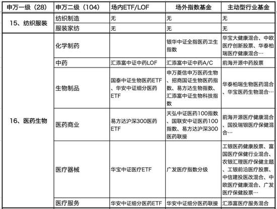 15、纺织服装。无对应行业基金。16、医药生物。二级行业化学制药对应的场外指数基金有银华中证全指医药卫生指数增强,主动型行业基金有华宝大健康混合、中欧医疗创新股票、华泰柏瑞医疗健康混合;二级行业中药对应的场内基金有汇添富中证中药指数LOF,场外指数基金是其联接基金,主动型行业基金有前海开源中药研究精选股票;二级行业生物制品对应的场内基金有国泰中证生物医药ETF、华安中证细分医药ETF,场外指数基金有申万菱信中证申万医药生物、招商国证生物医药指数、易方达生物科技指数、汇添富中证生物科技指数,主动型行业基金有华泰柏瑞生物医药混合、华宝医药生物混合;二级行业医药商业场内基金有易方达沪深300医药ETF,场外指数基金有天弘中证医药100指数、国联安中证医药100指数、易方达沪深300医药ETF联接,主动型行业基金有前海开源医疗健康混合、国投瑞银医疗保健混合;二级行业医疗器械场内基金有华宝中证医疗ETF,场外指数基金有广发医疗指数分级,主动型行业基金有工银医药健康股票、富国医疗保健行业混合、农银汇理医疗保健主题、工银前沿医疗股票、中信建投医改混合、中欧医疗健康混合、广发医疗保健股票;二级行业医疗服务场内基金有华安中证细分医药ETF,场外指数基金是其联接基金,主动型行业基金有汇添富医疗服务混合。