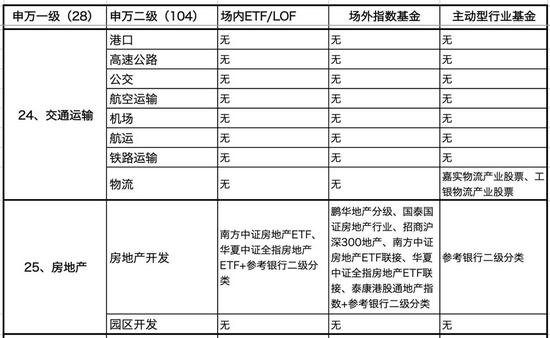 24、交通运输。二级行业物流对应的主动型行业基金有嘉实物流产业股票、工银物流产业股票。25、房地产。二级行业房地产开发对应的场内基金有南方中证房地产ETF、华夏中证全指房地产ETF以及相关的金融地产主题ETF,场外指数基金除了两只ETF联接基金还包括鹏华地产分级、国泰国证房地产行业、招商沪深300地产等权重、泰康港股通地产指数以及金融地产主题指数基金。