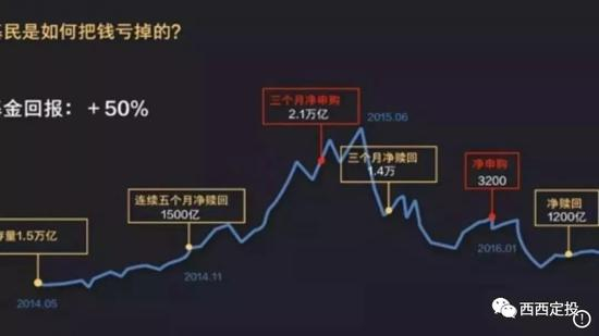 我们看下2014-2015年的牛市“基民是如何把钱亏掉的”,这张图很清楚的还原了当年的情景。