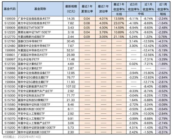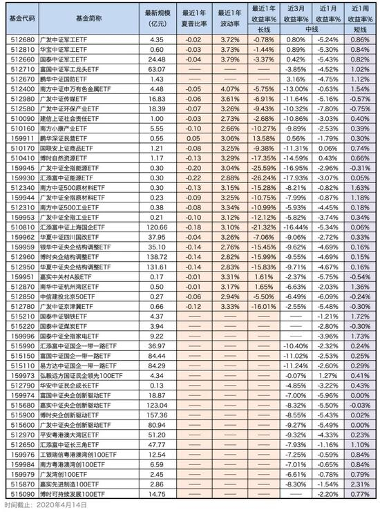 从(长线)最近1年夏普比率、波动率、收益率指标来看,广发中证军工ETF、华宝中证军工ETF、国泰中证军工ETF、建信上证社会责任ETF、嘉实中关村A股ETF、鹏华深证民营ETF表现较好。从短线指标看,广发中证环保产业ETF、中信建投北京50ETF和几只军工主题ETF贝塔弹性较好。