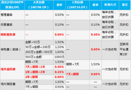如果投资者预计持有该基金的时间超过2年,选择A类份额更适合,如果只是短期炒作,那么选择C类份额的交易成本会更低。这时候,基金江湖上流传的“长持A,短炒C”的说法就可以安排上了!但需要注意的是,因为申购费和赎回费是一次性收取,即便是短炒嘉实沪深300ETF联接(LOF)C(160724.OF),持有时间达到7天费用会更低,否则就会被惩罚性的收取1.5%的赎回费。