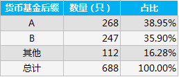 截至2020年10月29日,Choice数据显示,当前共有688只货币基金,类别种类繁多,比如东方红货币基金旗下的份额就分为了五类,分别为东方红货币A(005056.OF)、东方红货币B(005057.OF)、东方红货币C(007864.OF)、东方红货币D(007865.OF)、东方红货币E(005058.OF)。但是,其中的A类和B类是市场中的主流,两者合计占比高达74.85%,其他类别的基金占比为16.28%。