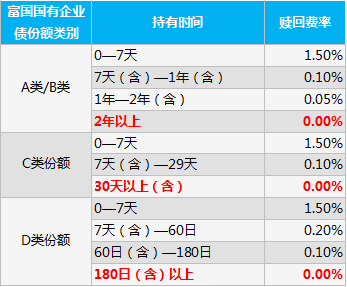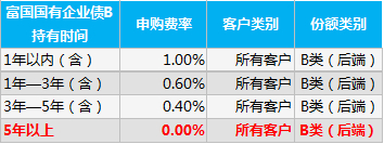 债基B类份额:B类份额通常为后端收费,申购费率通常与持有时长呈负相关,比如富国国有企业债B的持有时间越长,其后端收申购费率就越低,持有时间不足1年,费率为1%,如果持有五年以上,申购费率直接为零。