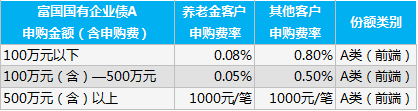 债基A类份额:基金的A类份额通常为前端收费,但是因投资者类别的不同也会有不同的申购费率,比如富国国有企业债A类份额的申购费,如果申购金额在500万元以下,养老金客户的申购费是其他客户的十分之一。不过各大互联网平台通常都已经将申购费降低至了1折。