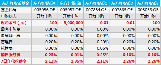 货币基金经常会分为A类和B类,但其实都是同一支基金,主要是最低申购金额和销售服务费上有所不同。通常而言,货币基金A类的申购门槛比较低,一般为100元,但销售服务费较高;货币基金B类的申购门槛较高,一般为500万元,销售服务费则较低。货币基金A类份额主要面对的是资金量较小的个人投资者,B类主要是面对资金量较大的机构投资者。由于服务费的不同,所以B类的收益通常都会高于A类。比如东方红货币基金的5类份额,其申购费、赎回费、管理费、托管费均相同,主要是起购金额和销售服务费的差异,这导致了不同的收益率。