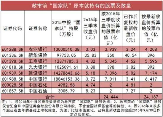 “国家队”的救市行为主要发生在去年7月初至三季度末,在去年7月8日证监会宣布证金公司资金申购公募基金之时,沪指点位尚在3500点一线,其后经过几轮下跌,最低跌至当年8月26日的2850.71点,而整个9月份基本上都围绕3000点一线窄幅震荡,至三季度末沪指收在3052.78点,因此大体上可依据2015年三季度末的情况保守估计“国家队”的持股数量和持股成本(注:对于部分个股,“国家队”买股后,并未进入前十大股东或前十大流通股东名单,因此未在当年三季报披露,据此来推断,“国家队”实际持股规模应较统计的要大)。
