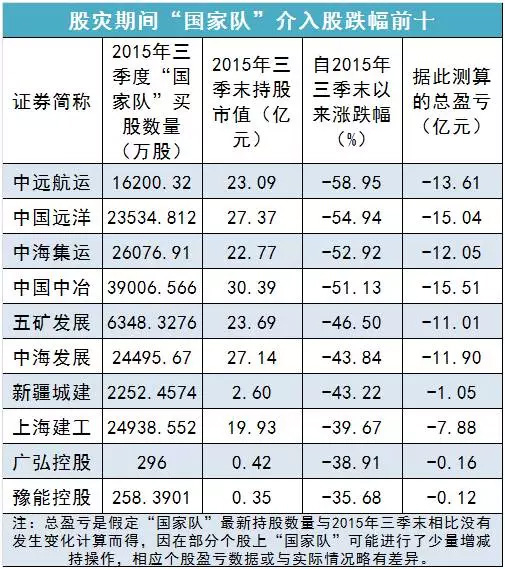 需要说明的是,“国家队”救市资金介入不同股票的时间不一,且多以上市公司股东信息变动方式披露,相关公告对“国家队”介入某只个股的具体成本多未提及,而且在股市稳定后,“国家队”也出现过一些增减持行为,因此要准确计算国家队买股成本和盈亏状况既不科学,也不现实,只能采用相对合理的办法进行估算。