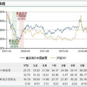 嘉实海外中国混合成立以来总回报为-14.4%,跑赢沪深300总回报-35.21%,与国际QDII混合型基金总回报-14.40%持平。从上图可见,受国际金融危机影响,2007-2009年间亏损最厉害。