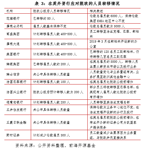 一是金融机构遵循“效率最高、成本最低”原则进行转移。目前,在不确定性背景下,外资金融机构应对脱欧的基本思路是逐步满足最低监管要求。英国《金融时报》对多位银行高管的采访显示,为保留更多选择权,在英大型国际银行暂不针对脱欧采取更多行动,通过尽可能少地转移人数和业务,使其在应对政治不确定性的同时将成本降至最低。一方面,立足客户需求和监管合规,迁移至欧盟的人员和业务保持在最低水平,例如投行业务、销售和交易以及合规人员等。另一方面,尽可能保持现行业务管理模式不变,原则上在提升经营效率的同时降低成本。保持现有的以法人实体与管理路径地理分离的欧非地区业务管理模式。管理路径以效率和人才为先,视伦敦为重要的金融管理中心,选取欧盟内法人机构辐射欧盟内业务,替代人员迁移。截至2019年3月,伦敦排名前15的大型国际银行共减少工作岗位3500个,占伦敦全部雇员的5%,其中仅有不到1500人的转移与脱欧有关(表3)。