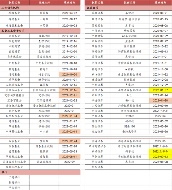 注:1.由于公开信息源能获取到的信息有限,上述为不完全统计,展示结果仅做参考;(下同)2.部分基金投顾机构仅披露了获准展业的日期,未披露业务开展日期,展业日期中通过底色进行区分,橙色标识为获准展业日期,且已正式开展基金投顾业务;黄色标识为获准展业日期,但尚未获取到是否已正式展业。
