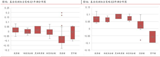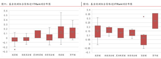我们通过RankIC指标来考察基金投顾组合策略在同类型产品中业绩排名的持续性,从指标值分布来看,近1年股票型、偏股混合型、偏债混合型的组合策略RankIC的均值都位于0值以下,业绩排名不具有持续性,这可能受近1年股票市场主线不明晰、风格不断轮动影响较大;近3年各类型的组合策略RankIC的均值都位于0值以上,从各类型组合策略的均值与中位数水平来看,除了债券型外指标值都有所提高,但最高值不到0.4,大都位于0.05至0.25之间,整体上持续性不强,考虑到市场系统性因素的影响,业绩排名的持续性可能更弱。总体来看,基金投顾组合策略的业绩排名延续性较差,根据排名来选择组合策略并不靠谱。
