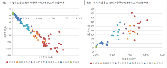 从中长期表现来看,近3年股票型与混合型组合策略的收益均值低于中国股基指数、中国混基指数,但波动率均值与最大回撤均值也更低;债券型组合策略收益均值高于中国债基指数,但风险相对更高;货币型组合策略的风险均值与收益均值表现均不及货币基金指数。