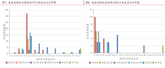 我们通过正收益占比来刻画基金投顾组合策略按月度投资的盈利概率,正收益占比越高代表盈利概率越大,投资者的投资体验越佳。从基金投顾组合策略的正收益占比分布来看,近1年,除货币型外的其他类型组合策略的正收益占比集中在20%至50%区间,代表着在过去1年中如按照月度去投资这些组合策略,亏损的概率相比盈利的概率更大,这与近1年股票市场的总体表现基本吻合;近3年所有的组合策略正收益占比均大于50%,盈利概率更大,与区间内股票市场整体向上的表现也基本一致。一方面体现出了长期投资所带来的价值,不要为短期的收益所诱惑,也不用对短期内的风险过于恐惧;另一方面也表明基金投顾组合策略承担的主要还是股票市场系统性风险,这也是无法回避的风险因素。