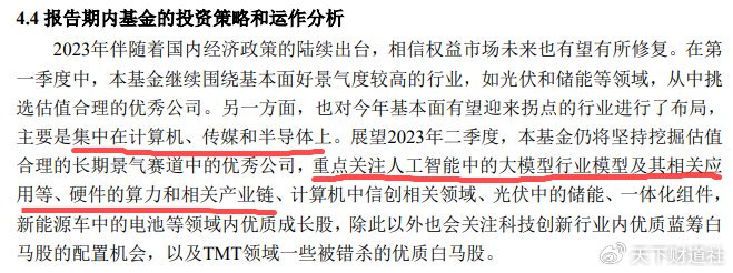 在2023年一季报中,上银科技驱动是这样表述的,“展望2023年二季度,本基金仍将重点关注人工智能中的大模型行业模型及其相关应用等、硬件的算力和相关产业链、计算机中信创相关领域”。
