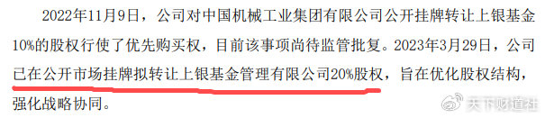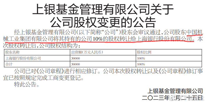 2023年7月,中国机械集团将其持有的公司10%的股权转让给上海银行,后者实现对上银基金的全资控股。