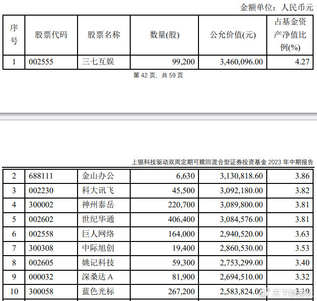 但是,似乎也不全如此。比如一季度末到上半年末,上银科技驱动都持有金山办公、科大讯飞、而这两只股票,直到上半年末一直维持强势。其第一大重仓股三七互娱,也基本涨到上半年底。