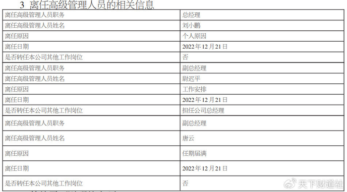 2022年末,公司总经理刘小鹏因个人原因离任,副总经理尉迟平转任公司总经理,副总经理唐云因任期届满离任。