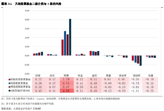 除积极投资股票基金及灵活配置混合基金外,其他类型基金的规模因子得分高于市场平均水平 2 个标准差,表明其持有的股票规模较大。主动权益类基金(积极投资股票基金、偏股混合基金、灵活配置基金)较其他类型基金呈现出较强的成长、波动、动量特性。
