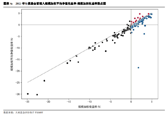 从产品收益率与加权平均净值收益率来看(规模加权至基金管理人层面),仅少数基金管理人的规模加权平均净值收益率高于其规模加权收益率且为正收益(图表 4 中红色标注的点),为基民带来较好的持有体验。