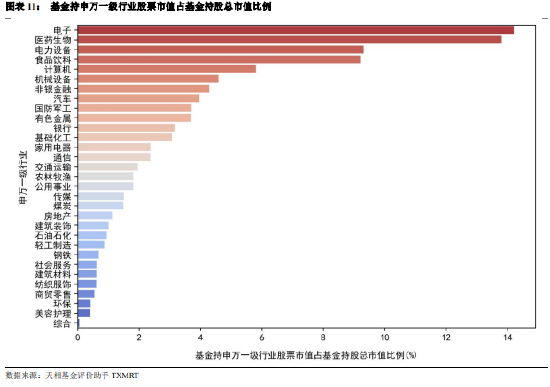 从申万一级行业来看,公募基金持申万一级行业股票市值占基金持股总市值比例前 3 的行业分别为:电子(14.20%)、医药生物(13.80%)、电力设备(9.31 %)。