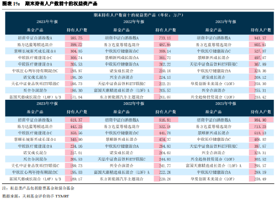 从持有人户数来看,2023 年年报与上期相比,招商中证白酒指数 A、易方达蓝筹精选混合、中欧医疗健康混合 C、景顺新兴成长混合 A 依然排名前四,且本期持有人户数持续保持下滑趋势。