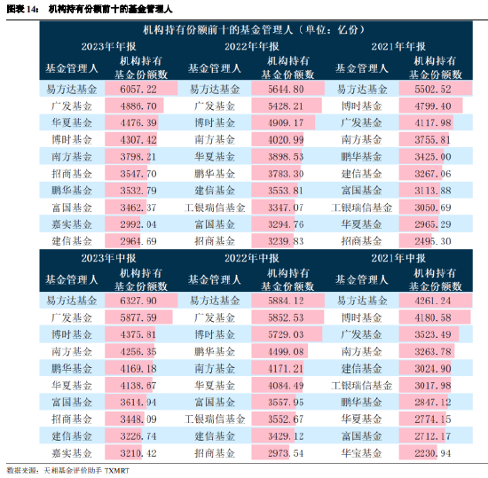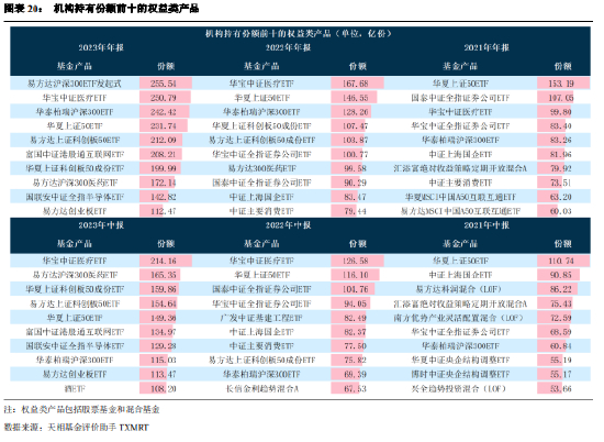 从机构投资者持有份额来看,机构持有份额前三的基金管理人是易方达基金、广发基金和华夏基金,其中只有华夏基金份额数相对于 2023 年中报数据有所上升。